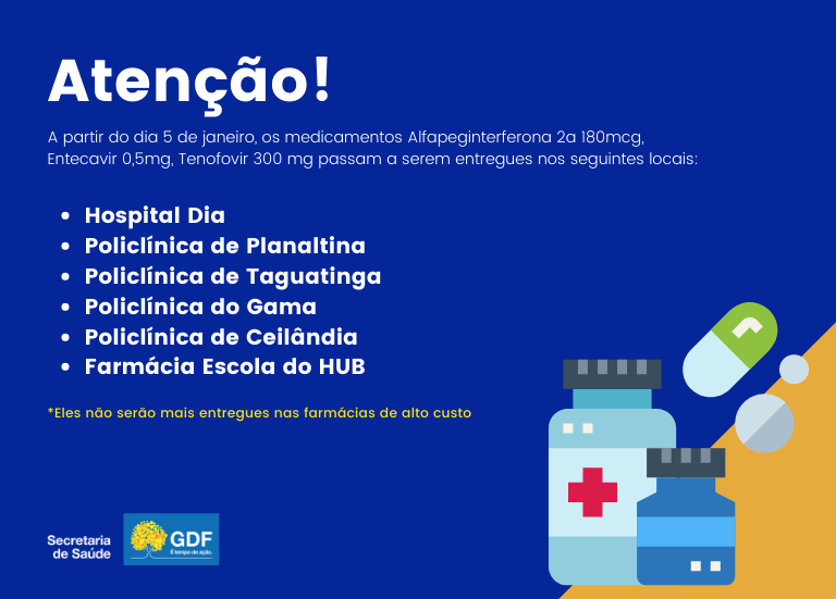 Os pacientes que estão em tratamento contra a hepatite B contam com novos pontos para retirar os medicamentos por meio do SUS. A distribuição que ocorria nas três farmácias de alto custo agora ocorre em seis policlínicas localizadas em cinco Regiões Administrativas. Além de facilitar o acesso, também foi ampliada a rede para dispensação. A medida ocorre após o Ministério da Saúde alterar o perfil desses medicamentos saindo do Componente Especializado para o Componente Estratégico.