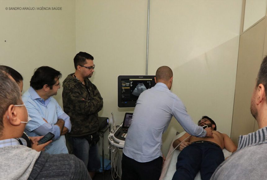 Instrutor do curso, o médico radiologista Diego Nascimento dos Santos, explica que, além de ensinar sobre como é o uso do aparelho, a capacitação é focada nas situações em que o equipamento pode ser utilizado e o diagnóstico correto. É um curso prático. A partir daqui, eles passarão a utilizar o ultrassom no seu dia a dia”, acrescenta.