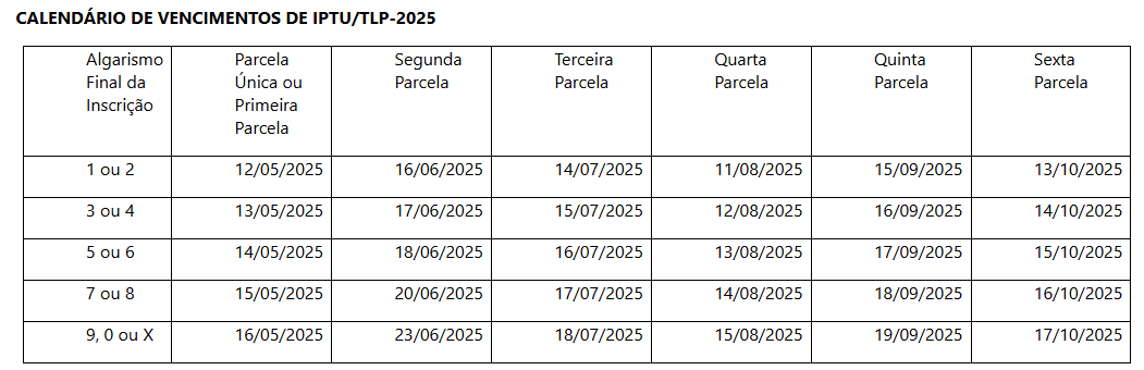 Já o IPTU começa a ser pago em maio. As datas de vencimento são definidas de acordo com o número final (dígito verificador) da inscrição do imóvel no Cadastro Imobiliário do Distrito Federal (CIDF). A cota única e as primeiras parcelas vencem entre os dias 12 e 16.