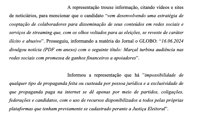 Para o promotor, Marçal se utilizou de colaboradores para difundir o conteúdo de campanha em plataformas digitais, sem que houvesse transparência quanto ao emprego de recursos. Medida essa que levou Peteam a requerer, também, a quebra de sigilo bancário das empresas do coach.