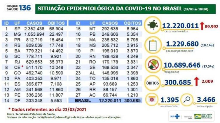 Com 2.009 mil mortes nas últimas 24 horas, o total de vidas perdidas para a covid-19 totalizou 300.685. O número não inclui os óbitos ocorridos no Ceará, que alegou problemas técnicos para não enviar a atualização. Ontem (23), o número estava em 298.676.