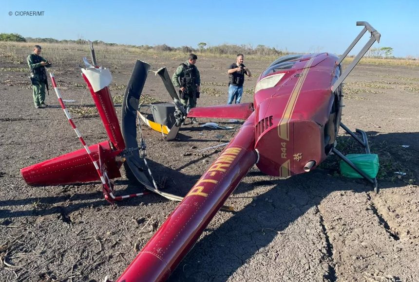 O helicóptero, modelo Robinson R-44, matrícula PT-RMM, estava parcialmente destruído, porém sem sinais de pessoas feridas. Na ocasião em que foi encontrado, a PF realizava monitoramento de uma suposta situação de tráfico internacional de drogas. A Polícia Federal contou contou com suporte de agentes do Cento Integrado de Operações Aéreas (CIOPAer) e do Grupo Especial de Fronteira (Gefron), ambos vinculados a Secretaria de Estado de Justiça e Segurança Pública do Mato Grosso (SEJUSP-MT).