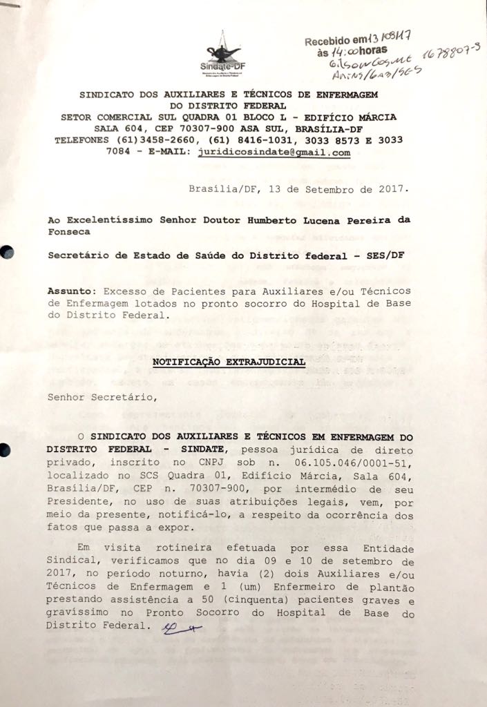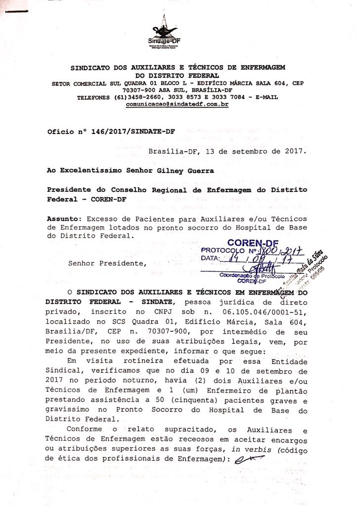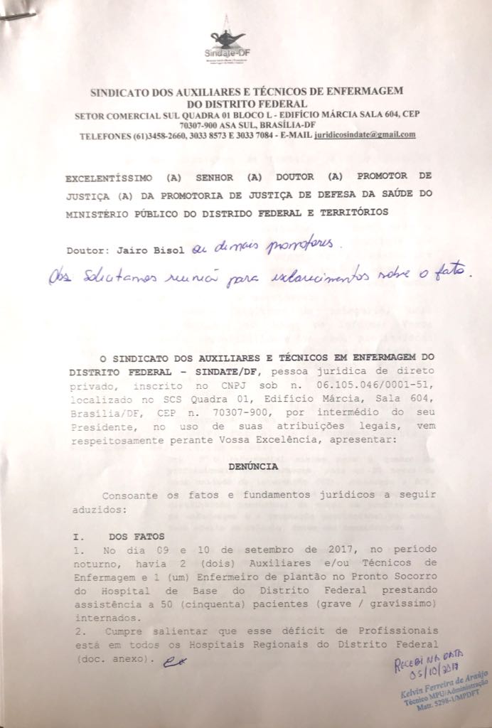 Dado acontecimento de superlotação de pacientes nos prontos socorros dos hospitais da rede de saúde do DF, que ocorreram nos últimos meses, conforme divulgado pelo Sindate, a direção do sindicato formalizou a denúncia ao Ministério Público do Distrito Federal e dos Territórios (MPDFT), na tarde da quinta-feira (05/10), e notificou a Secretaria de Estado de Saúde (SES-DF) e o Conselho Regional de enfermagem (COREN-DF), para que tomassem uma providência relacionado ao ocorrido.