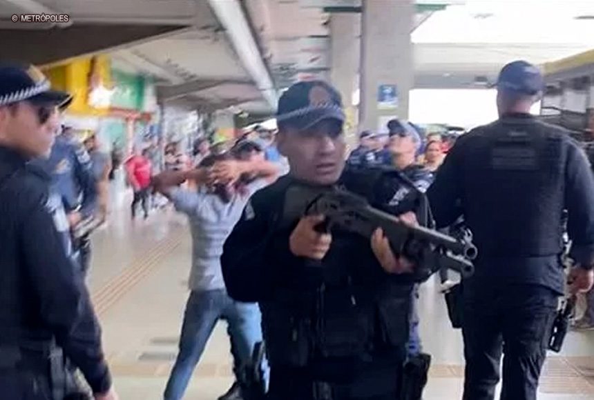 Outro agente entra empunhando uma escopeta e grita para que os vendedores saiam do local. Ele chega a perguntar “quem quer tiro?” e aponta a arma para uma mulher que o questiona. Em seguida, o mesmo oficial ordena que a pessoa que filma a ação se afaste, enquanto outro policial sacode o que parece ser um frasco de spray de pimenta.