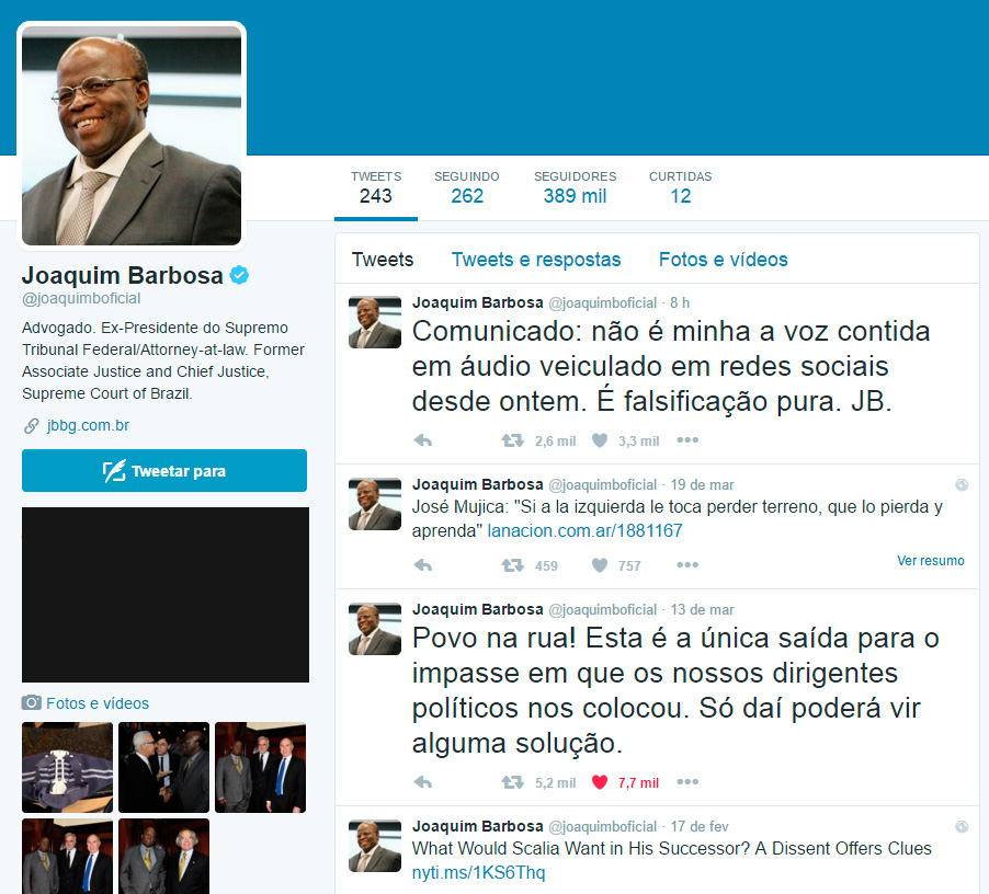 Embora Barbosa já tenha se pronunciado em relação à força da população para mudar o cenário político do país, a exemplo de postagem no microblog Twitter, em 13 de março em que publicou: “Povo na rua! Esta é a única saída para o impasse em que os nossos dirigentes políticos nos colocou. Só daí poderá vir alguma solução.”.