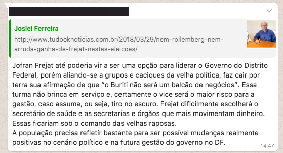 Em um grupo do aplicativo Whatsapp, um cidadão, reagiu a uma matéria publicada pelo blog Tudo Ok Notícias, sobre apontamento em pesquisa de possível vitória do pré-candidato ao GDF, Jofran Frejat, contra adversários a exemplo do governador do DF, Rodrigo Rollemberg (PSB) e de José Arruda (PR).