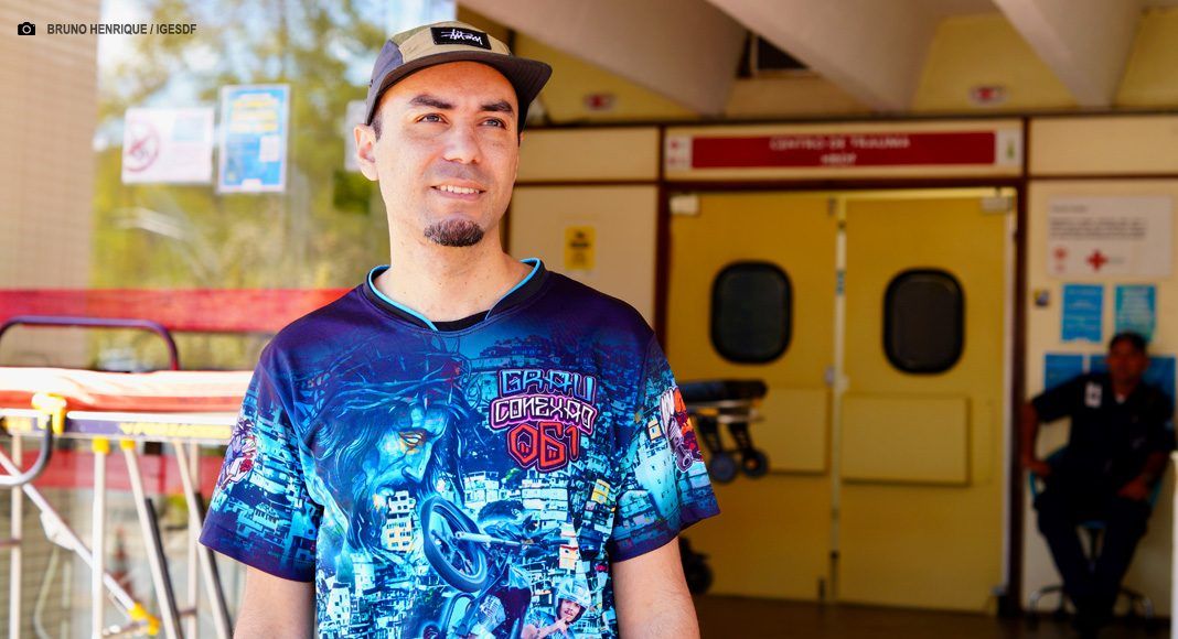 Na manhã do Dia das Mães de 2024, o motoboy Walysson Concheski Machado, de 35 anos, saiu para mais um dia de trabalho sem imaginar que estava prestes a enfrentar o maior desafio de sua vida. Durante uma entrega, ele sofreu um grave acidente de moto e foi levado em estado crítico para a Sala Vermelha do Hospital de Base do Distrito Federal (HBDF). “Fiquei 21 dias na UTI lutando pela vida”, lembra. “Quando acordei, percebi que estava vivo por um milagre e por causa de cada profissional que cuidou de mim. Renasci naquele hospital”.