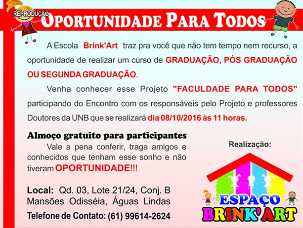 Para conhecer mais sobre o projeto, o interessado deve participar de um almoço gratuito na Escola Brink’Art, no próximo dia 8. O encontro terá a presença dos responsáveis pelo projeto e professores da Universidade de Brasília.