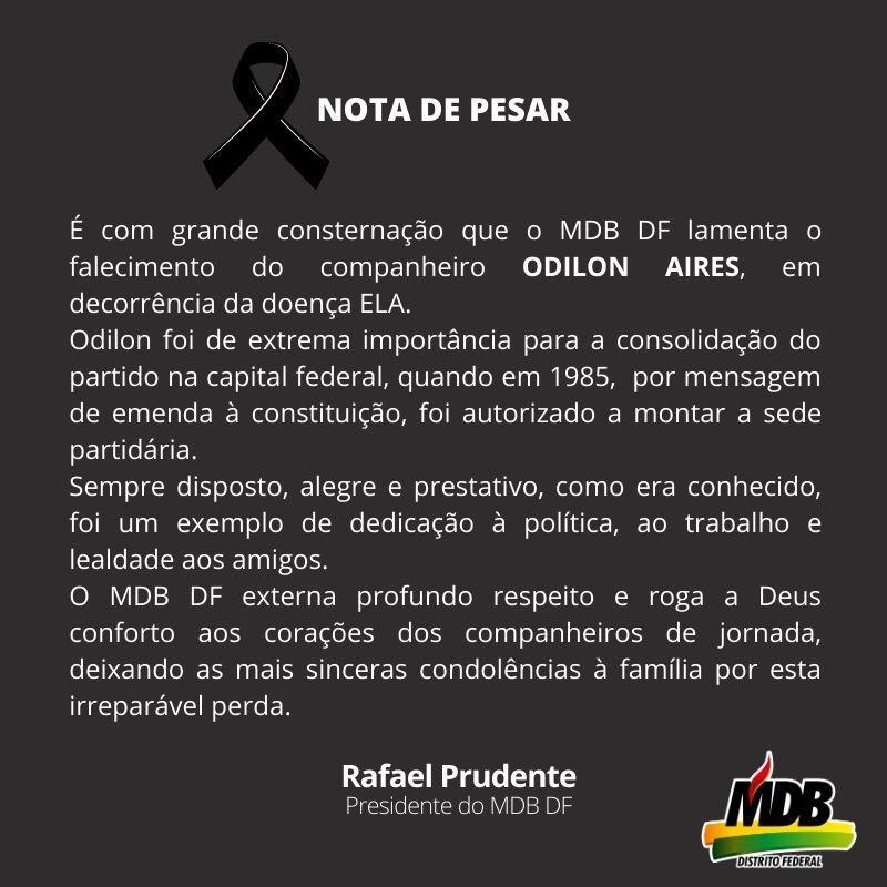 “Foi com enorme pesar que recebi a notícia no falecimento de Odilon Aires, meu companheiro de partido e um dos mais ativos líderes na luta pela emancipação política do Distrito Federal.