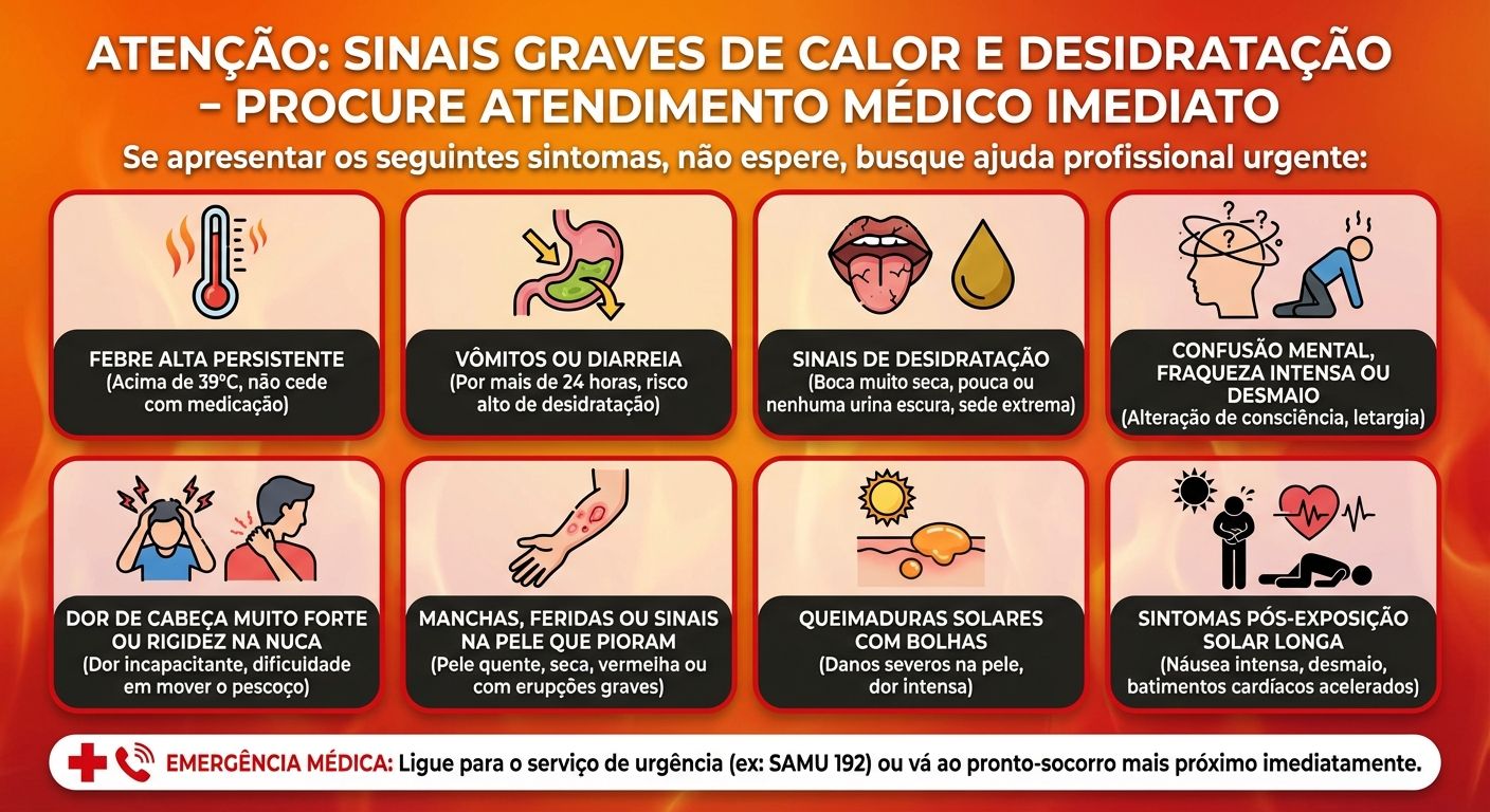 A busca por assistência profissional deve ser imediata em casos de febre alta persistente ou confusão mental. Sinais de desidratação como boca seca, pouca produção de urina e tontura indicam a necessidade de intervenção clínica. O sistema de saúde do Distrito Federal permanece em vigilância para casos de queimaduras solares que apresentem bolhas ou feridas.