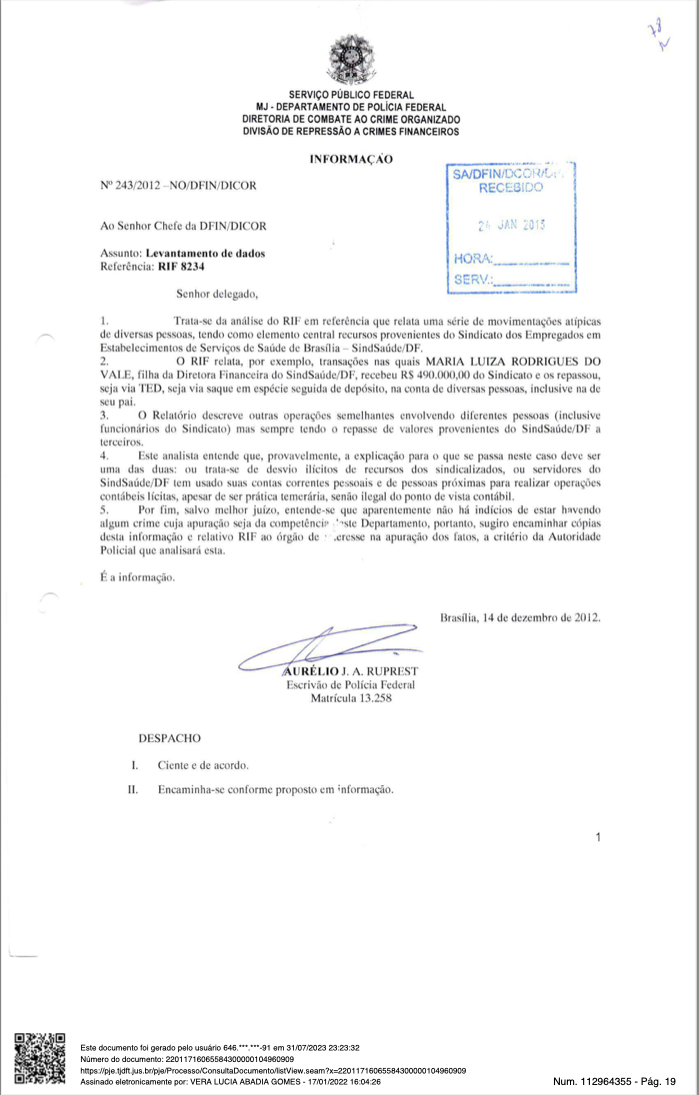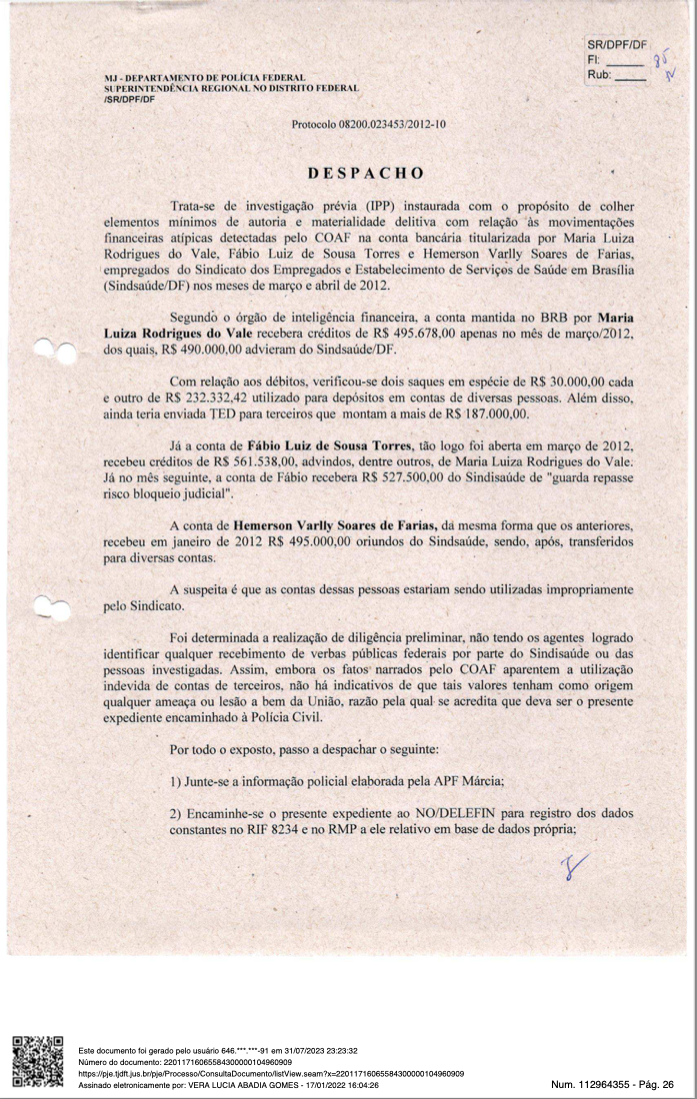 Embora supostas posses de alto valor, inclusive com eventuais laranjas, e ações mais recentes, que envolvem milhões e muitos sindicalizados insatisfeitos, ou de bolsos vazios com precatórios vendidos pelo SindSaúde, com denúncia aceita pelo Ministério Público do DF e Territórios (MPDFT), não apareçam no relatório do MPU, PF e PCDF, o inquérito policial, em investigação, apontam alguns encaminhamentos.