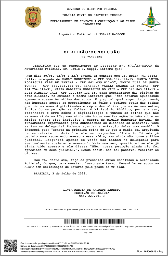 Mas, ao que tudo indica, entre os dias 30 de maio e 22 de junho, a PCDF relata que chegou a tentar agendar o primeira oitiva de Marli Rodrigues e parentes, porém, tais agendamentos foram impossibilitados porque a defesa aguarda acesso a mídias e informações processuais.