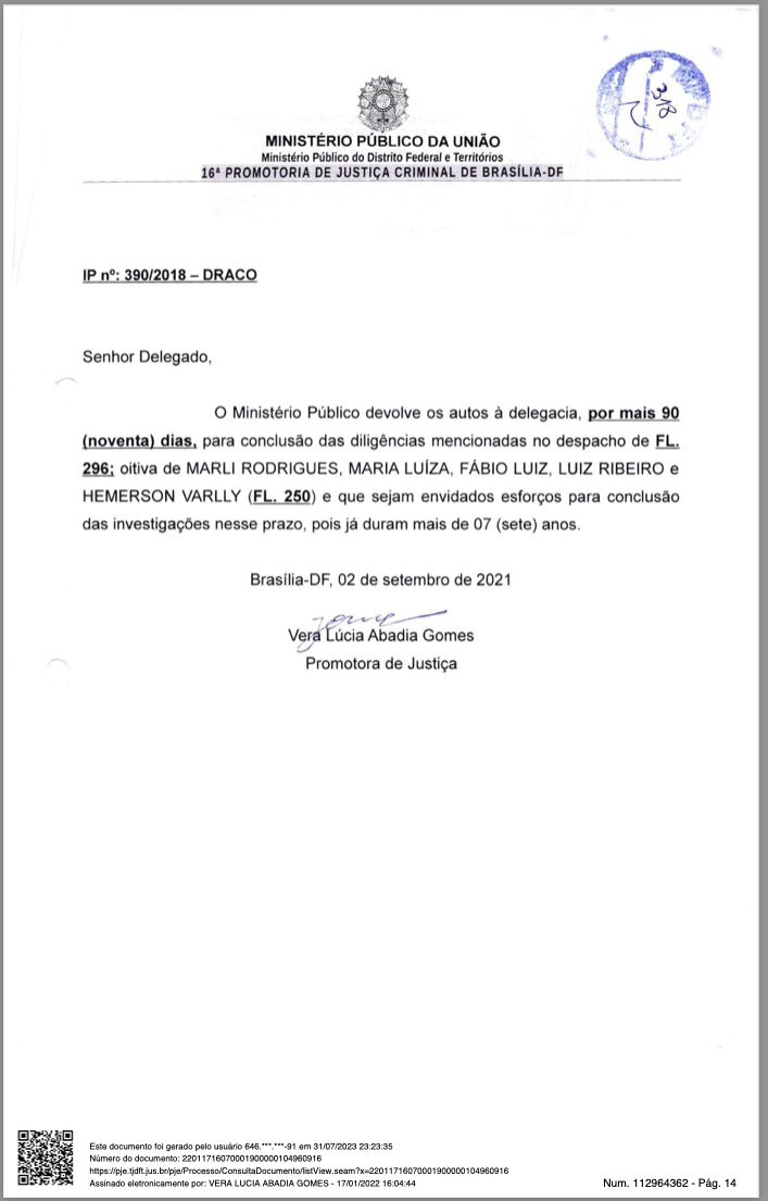 Em 2021, o MPF chegou a cobrar celeridade por parte da PCDF, uma vez que, há época, a investigação transcorria “Há mais de sete anos”. Algo que à época, a Policia Civil acabou por justificar, a pandemia do coronavírus, como um dos fatores para a morosidade do andamento das investigações.