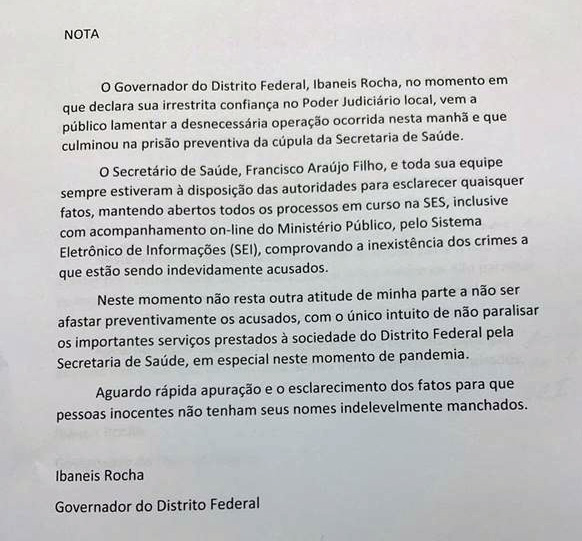 Por meio de nota, Rocha lamentou o episódio e classificou a operação de “a desnecessária operação ocorrida nesta manhã e que culminou na prisão preventiva da cúpula da Secretaria de Saúde”, uma vez que os gestores estavam à disposição para esclarecimentos.
