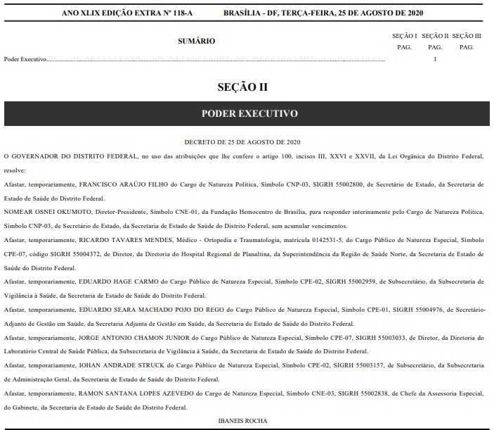 Além de Araújo, o governador afastou ainda, temporariamente, o ex-secretário adjunto de Assistência à Saúde do DF, Ricardo Tavares Mendes, então diretor do Hospital Regional de Planaltina (HRPL), o subsecretário de Vigilância à Saúde da SES-DF, Eduardo Hage Carmo, o secretário adjunto de Gestão em Saúde do DF, Eduardo Seara Machado Pojo do Rego, o diretor do Laboratório Central do DF (LACEM), Jorge Antônio Chamon Júnior e o assessor especial da Secretaria de Saúde da SES-DF, Ramon Santana Lopes Azevedo.
