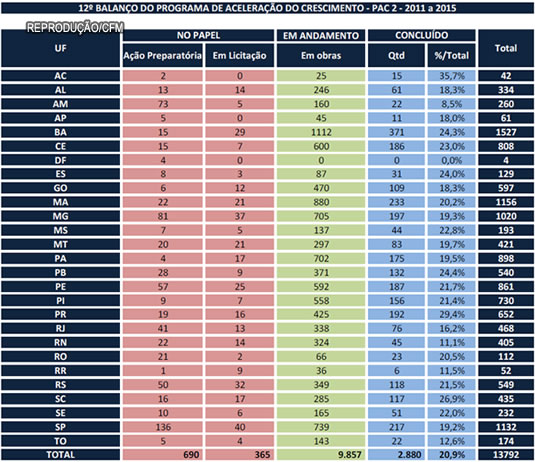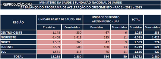 Desde o lançamento do PAC, o governo federal tem feito anualmente um balanço das obras concluídas. Com base nesses dados, o CFM acompanha, há pelo menos quatro anos, a entrega das ações previstas na área da saúde. Em todos os anos, a conclusão dessas obras ficou aquém do esperado. No 11º balanço do PAC, por exemplo, divulgado em 2015 e referente às obras concluídas até outubro de 2014, haviam sido entregues apenas 12% das UBSs e 8% das UPAs programadas. Naquele levantamento, estavam incluídos ainda alguns projetos de saneamento de responsabilidade da Fundação Nacional de Saúde (Funasa), cujo percentual de entrega era de 38%, mas que não puderam ser adicionadas no monitoramento mais recente do CFM. Até 2014, as obras de saneamento faziam parte do PAC da Saúde, mas foram desmembradas no levantamento mais recente, dificultando o acompanhamento.