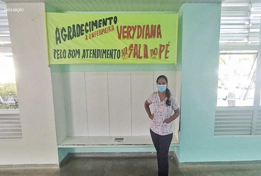 Uma faixa de agradecimento foi estendida no ambulatório do Hospital da Região Leste (HRL), no Paranoá. A mensagem veio de uma paciente com dedicatória a uma enfermeira que a atendeu no HRL com os dizeres “Agradecimento à enfermeira Veridiana pelo bom atendimento na sala do pé”. Essa foi a maneira que Maria de Lourdes Pereira dos Santos, de 65 anos, moradora do Paranoá, encontrou para homenagear Verydiana Saraiva de Carvalho, 35 anos, que atua no Centro de Atenção ao Diabético e Hipertenso (CADH).