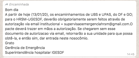 Uma mensagem que circulou em grupos do aplicativo de mensagem instantânea Whatsapp chamou atenção de usuários. Nela, a Gerência de Emergência do Instituto de Gestão Estratégica de Saúde do DF (IGESDF), passou a obrigar, desde segunda-feira (13/Jan), que encaminhamentos realizados por unidades Básicas de Saúde (UBSs) e de Pronto Atendimento (UPAs), ao Hospital Regional de Santa Maria (HRSM), devem obter autorização prévia, por meio de e-mail.