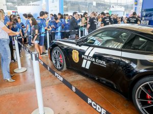 O estande da Polícia Civil fica logo na entrada da Campus Party, com uma viatura Porsche 911 Carrera 992, obtida de uma apreensão da PCDF. E conta com representantes da Delegacia de Repressão a Crimes Cibernéticos (DRCC), além de representantes da Divisão de Inteligência Policial.