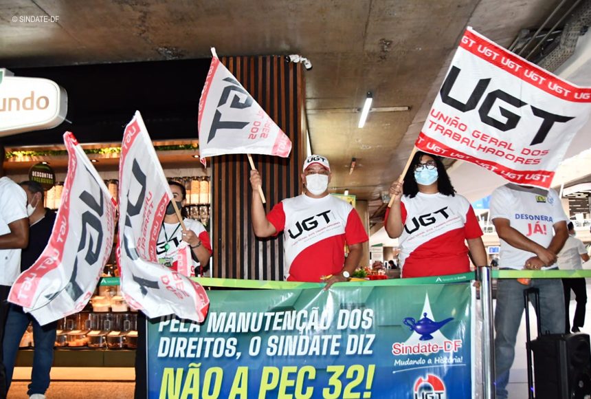 Na última quarta-feira (03/11), o diretor do Sindate e presidente da União Geral dos Trabalhadores (UGT-DF), Newton Batista, esteve presente no Aeroporto Internacional de Brasília e participou do movimento organizado por diversas centrais sindicais do país. “É preciso defender a manutenção do emprego, o concurso público e principalmente, que o servidor seja amigo do cidadão e fiscal do estado. Por isso, somos contra a PEC 32”.
