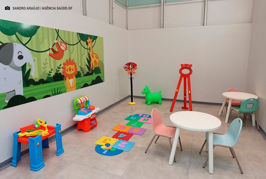 A brinquedoteca também passou por mudanças, oferecendo um ambiente lúdico e acolhedor às crianças em atendimento. Além de ser um espaço para fisioterapia motora e respiratória, o local conta com painéis no tema safari, brinquedos, mesinhas e cadeiras para compartilhamento.