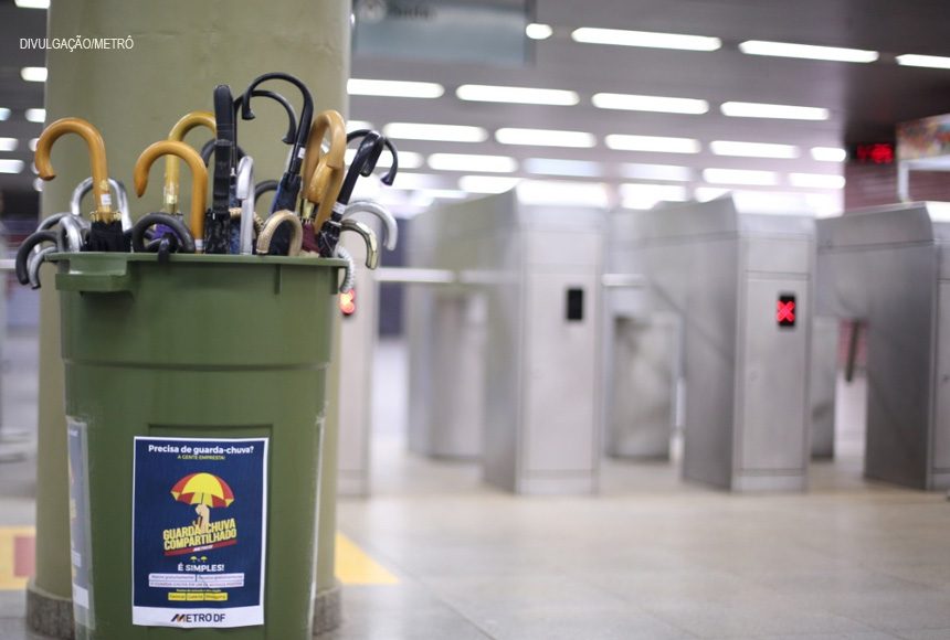 A Companhia do Metropolitano do DF (Metrô-DF) deu início, nesta terça-feira (21), à campanha Guarda-Chuva Compartilhado para permitir que, no período das chuvas no DF, seja feito o empréstimo dos objetos aos usuários para que possam utilizá-los no período de chuva. Os guarda-chuvas foram esquecidos no sistema metroviário e levados para o Posto Achados e Perdidos, que funciona na Estação Galeria, com período de permanência e guarda já expirado.
