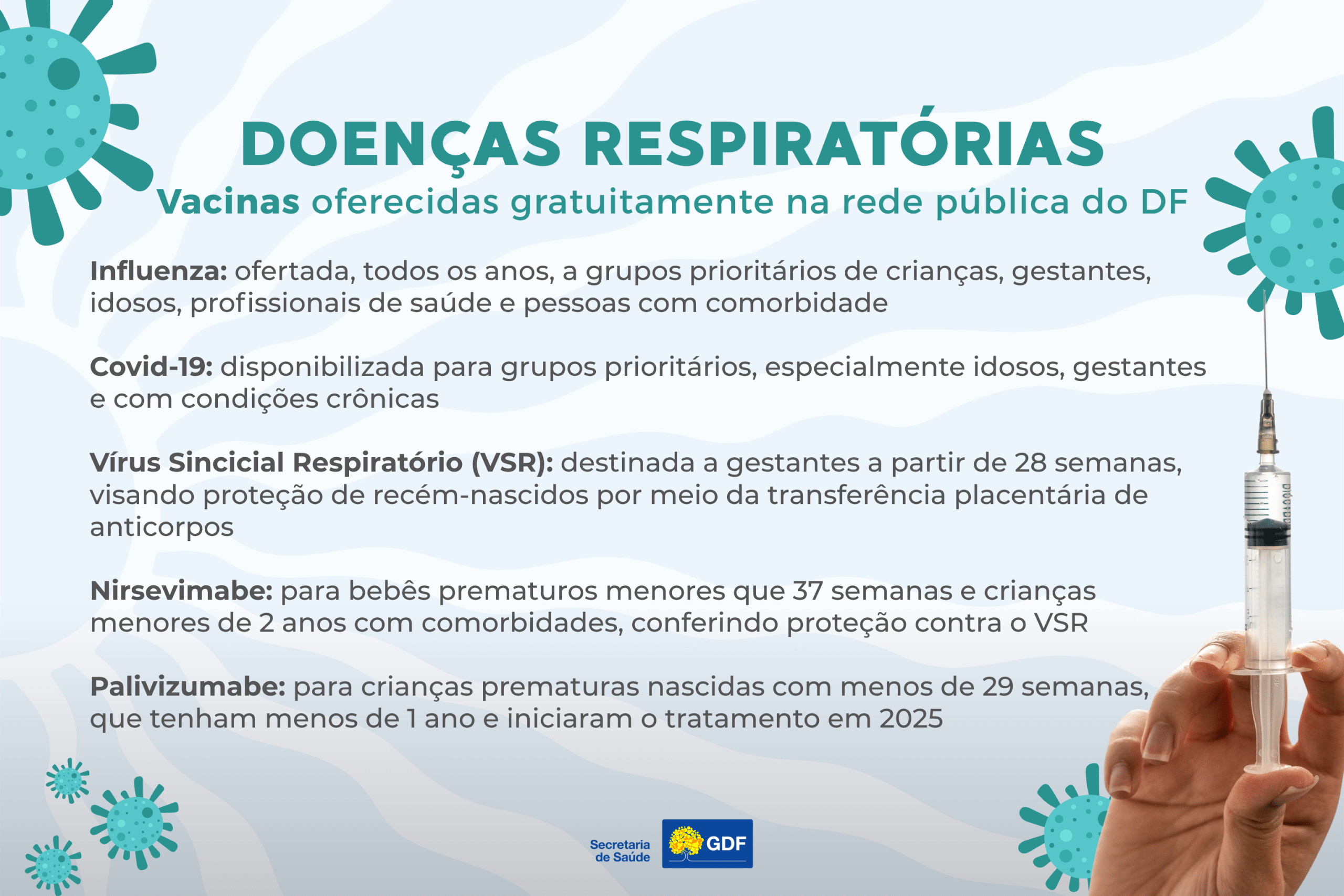 A vacinação é apontada como a principal estratégia para prevenir casos graves e reduzir a incidência e o número de mortes por vírus respiratórios. A rede pública do Distrito Federal oferece gratuitamente imunizantes para a população.