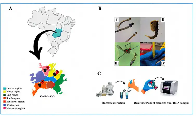 Após a captura, um total de 1.570 fêmeas adultas foram separadas e organizadas em grupos de dez insetos cada, contendo a cabeça e o tórax para análise, o que resultou na distribuição de 157 grupos para análise e investigação laboratorial. Os ovos dessas fêmeas foram cultivados em condições controladas de laboratório até o surgimento dos mosquitos adultos.