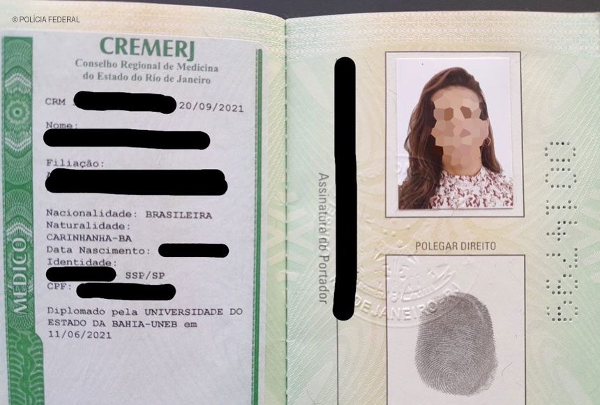 – aparelhos celulares, jalecos, carimbos, documentos de identificação, carteira CREMERJ, histórico escolar, diplomas, entre outros, com indícios de falsificação.