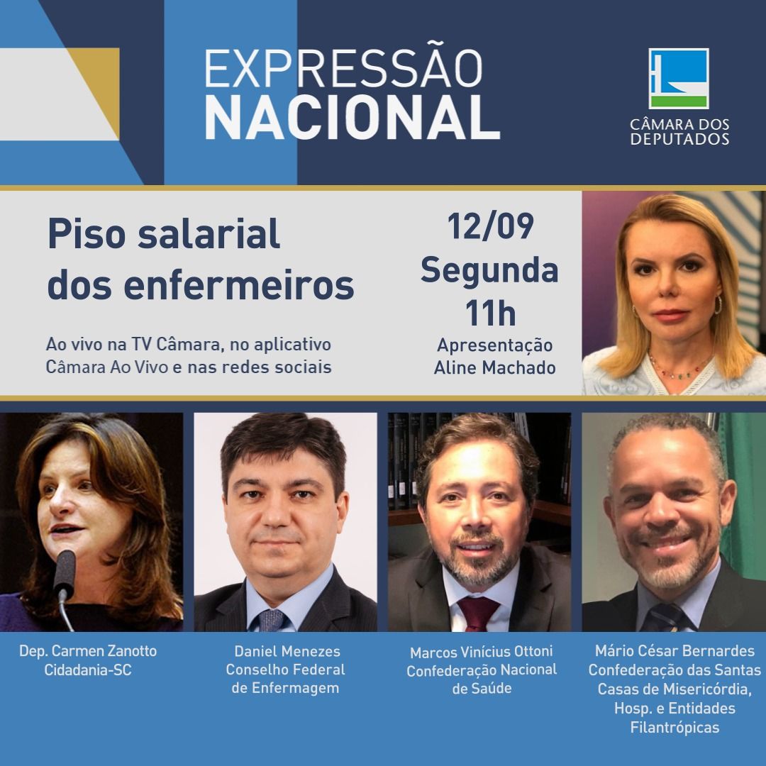 O Conselho Federal de Enfermagem (Cofen) deve participar, as 11 horas dessa segunda-feira (12/Set), do debate que ocorre no programa Expressão Nacional, da TV Câmara sobre o piso salarial dos enfermeiros. O Conselho, pretende defender a constitucionalidade e viabilidade do Piso Salarial da Enfermagem.