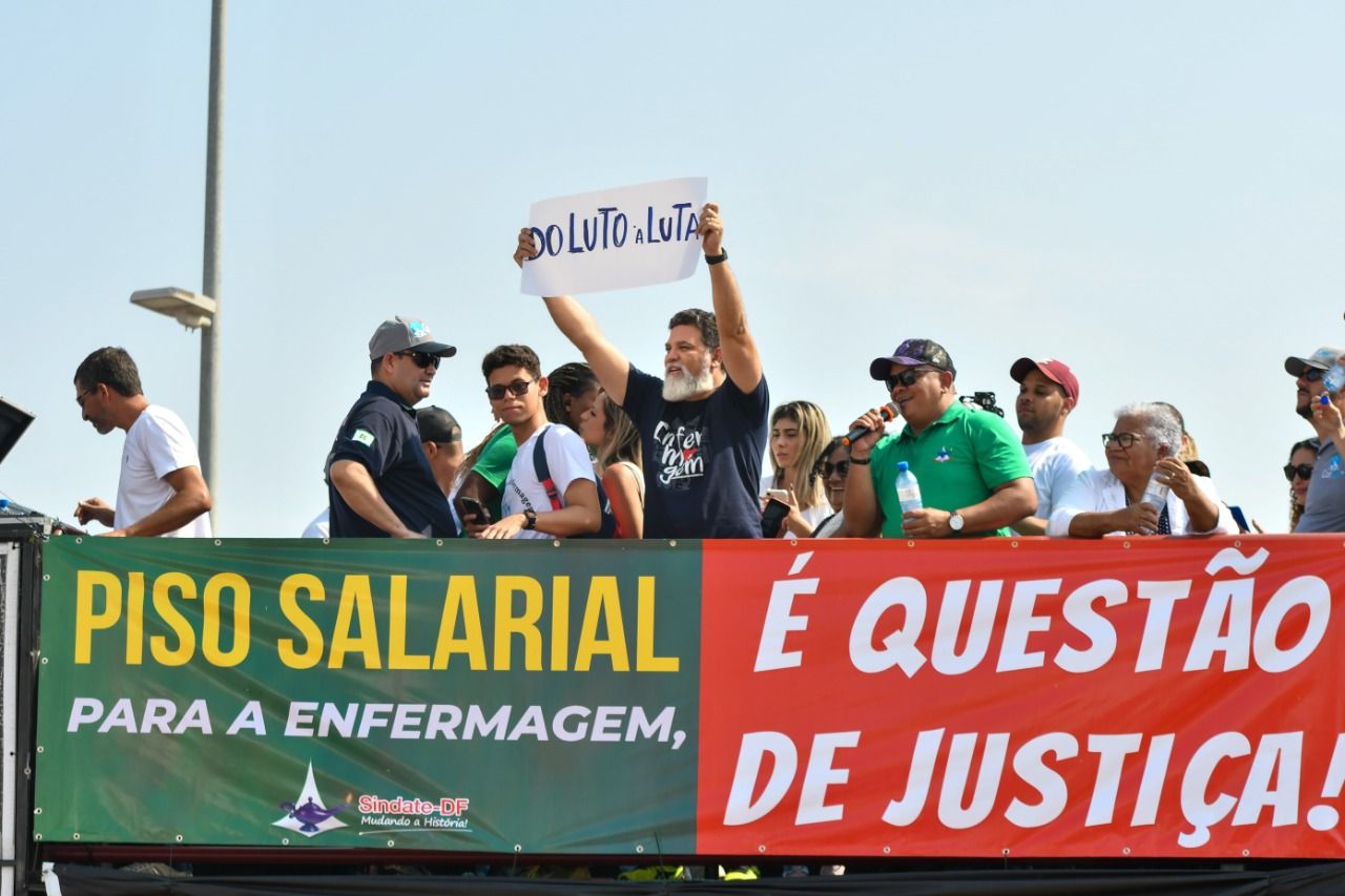 Ao som de “chega de sofrer calado”, entoado pelo deputado distrital, Jorge Vianna (PSD), juntamente com a direção do Sindicato dos Auxiliares e Técnicos em Enfermagem do DF (Sindate-DF), a Enfermagem do Distrito Federal deu arranque a 4ª Marcha da Enfermagem. Somando com os Enfermeiros convocados pelo Sindicato dos Enfermeiros do DF (SindEnfermeirosDF), cerca de 10 mil trabalhadores das redes pública e privada, fizeram o percurso do Museu da República até a Praça dos Três Poderes.