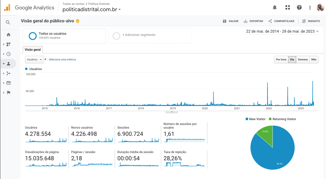 Na segunda-feira (30/Mai), Política Distrital (PD), no ar desde outubro de 2014, ultrapassou a marca de 15 milhões de visualizações de matérias, realizadas por 4,28 milhões de pessoas. Números esses que ultrapassam os 2,92 milhões de residentes no Distrito Federal, conforme estimativa do Instituto Brasileiro de Geografia e Estatística (IBGE), para 2023.