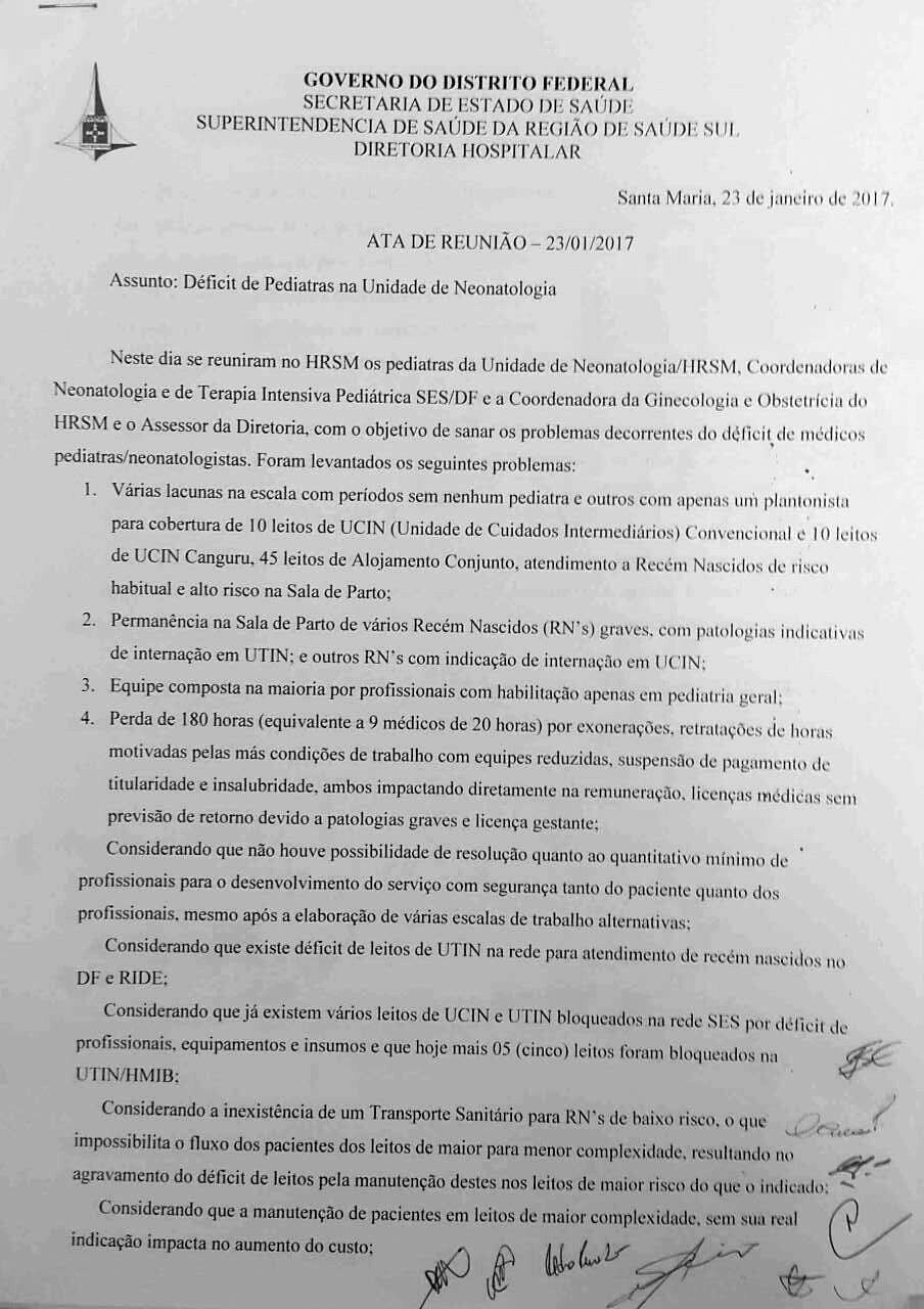 Embora as justificativas recaiam sobre a falta de neonatologistas, Ata de reunião de quinta-feira (26/Jan) aponta diversos motivos, relacionados a falta de estrutura, de profissionais e, também, à falta de gestão, comuns a diversas unidades de saúde do DF.
