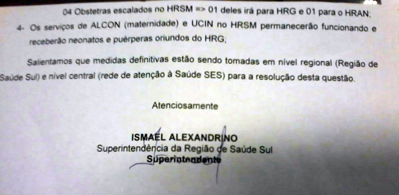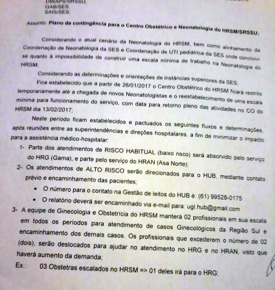 Embora possa ser apenas parte do “plano de contingência” da SES-DF, Política Distrital teve acesso a documento emitido pelo superintendente da Região de Saúde Sul, Ismael Vitorino na quinta-feira (26/Jan), em que é possível se constatar que as afirmações relacionadas aos obstetras e ginecologistas podem ser constatadas em previsões de deslocamentos desses profissionais do HRSM para as unidades do HRAN e HRG.