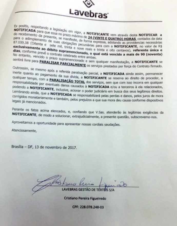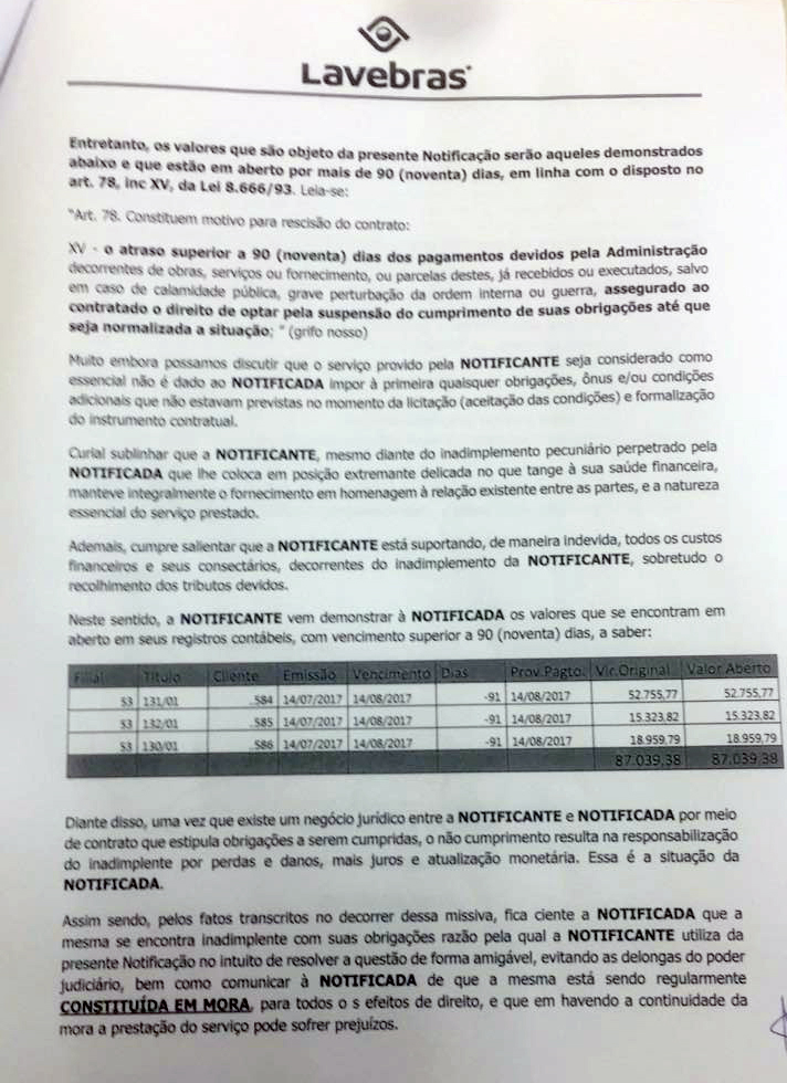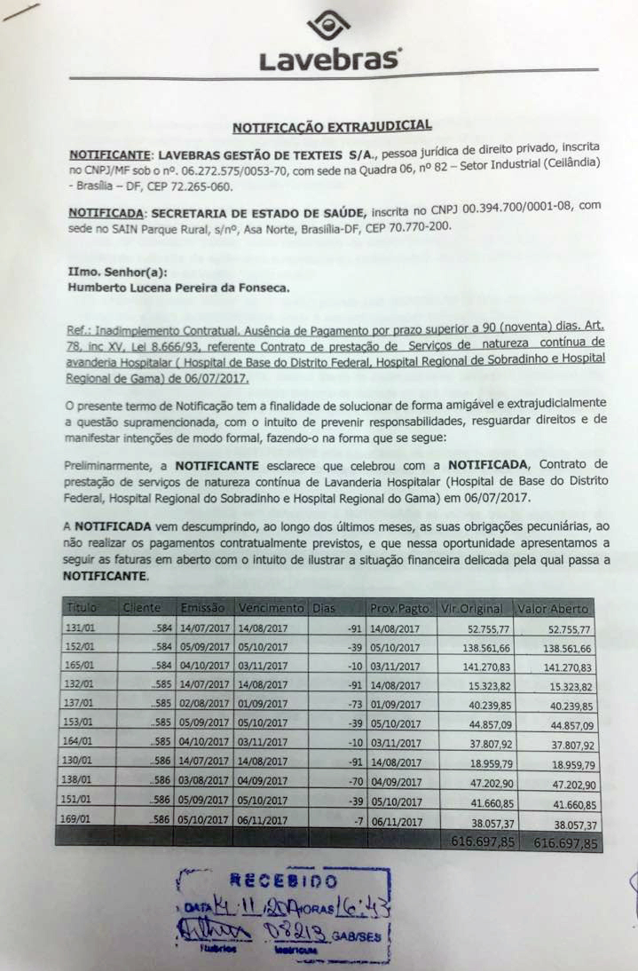 Ao Política Distrital (PD) a assessoria de comunicação da Laverbras encaminhou cópia da notificação Extrajudicial, com data de recebimento pela SES-DF, de 14 de novembro. No documento a empresa apresenta planilha com montante contratado, cerca de R$ 617 mil, as faturas em aberto que totalizam os R$ 87 mil devidos, além de quantificar os dias em atraso, até aquele momento.