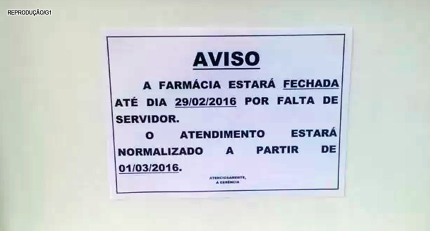 Com os servidores de atestado ou se aposentando, uma farmácia pública que funciona dentro de um centro de saúde no Distrito Federal vai ficar com as portas fechadas até 1º de março. A medida começou no dia 16 de fevereiro. Um cartaz colado na porta do local, no centro 14 do Cruzeiro Velho, avisa a população.