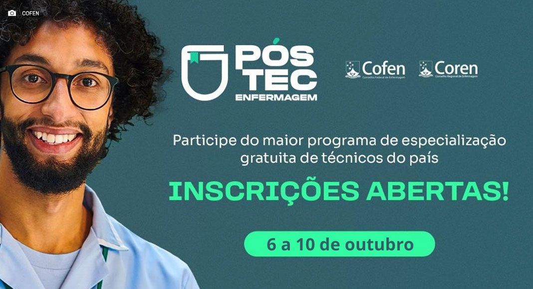 Estão abertas as inscrições para a quarta edição do Pós-Tec Enfermagem, o maior programa de especialização técnica de nível médio e gratuito do Brasil. A iniciativa oferece dez mil vagas em dez cursos de especialização, que serão preenchidas por ordem de inscrição. Os interessados devem se inscrever exclusivamente pela plataforma CofenPlay+ até as 23h59 do dia 10 de outubro.