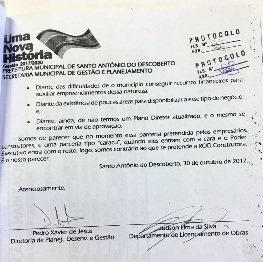 Há 45 quilômetros de distância da capital do país, Santo Antônio do Descoberto (GO) que, em maio de 2015, figurou o quadro Cadê o Dinheiro que Estava aqui, exibido pelo Fantástico, na Rede Globo, por supostas práticas de corrupção, recentemente deu uma demonstração de que as coisas mudaram. De forma jocosa, um parecer da Secretaria Municipal de Gestão de Planejamento, o Executivo local, descartou uma parceria ‘caracu’ prejudicial ao município, proposta por empresários de uma empresa de Construção.