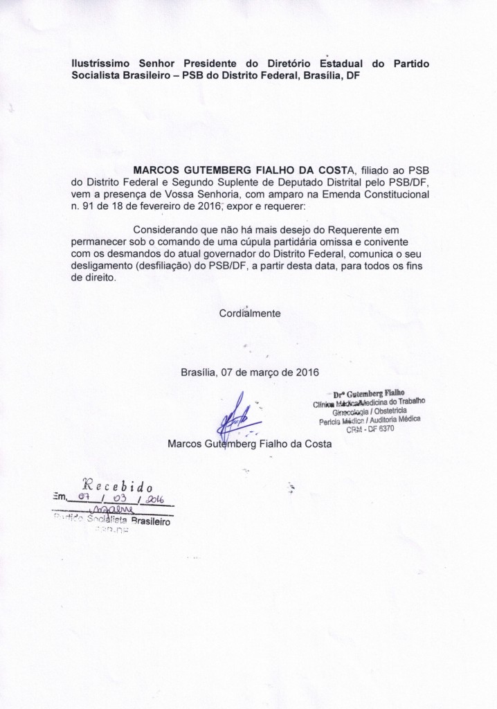 O segundo suplente à vaga de deputado distrital à Câmara Legislativa do DF e presidente do Sindicato dos Médicos do Distrito Federal (Sindmédico), Gutemberg Fialho pediu, na tarde desta segunda-feira (7/Mar), a desfiliação do Partido Socialista Brasileiro do DF (PSB-DF), legenda em que obteve nas últimas eleições 8.858 votos nas eleições de 2014.