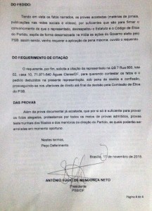 O Sindicalista reforça tal tese com a confirmação de Neves do PSB, onde apresenta matéria publicada pelo Jornal de Brasília e replicado por Política Distrital que corrobora com a saída de Neves do PSB. “Sendo que no dia 04.02.2016 foi noticiado que blog politicadistriytal que o Representante deixou o cargo de Chefe de Gabinete e desfiliou-se do PSB para filiar-se no Partido Rede (http://www.politicadistrital.com.br/2016/02/04/chefe-de-gabinete-de-rollemberg-deixa-cargo-e-troca-psb-pela-rede/)(SIC)”.