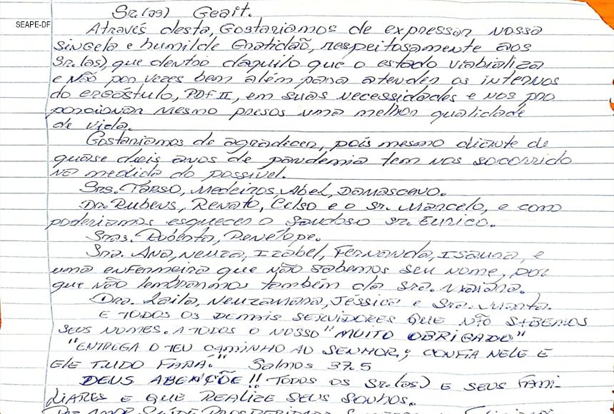 Movidos pelo espírito natalino e pelo sentimento de solidariedade que a época representa, custodiados da Penitenciária do Distrito Federal II (PDFII), localizada no Complexo Prisional da Papuda, em São Sebastião, resolveram expressar toda a gratidão e carinho junto à equipe de saúde que atua na unidade prisional.