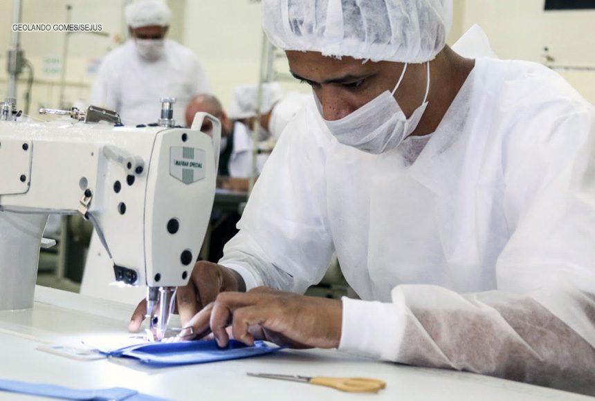 A oficina de costura já era realizada pela Sejus em parceria com empresas do Sistema S. Para atender essa produção, foi necessário somente a adequação do uso do maquinário e da expertise de detentos. A Funap trabalha pela inclusão e reintegração social das pessoas presas e egressas do sistema prisional, desenvolvendo seus potenciais como indivíduos, cidadãos e profissionais.