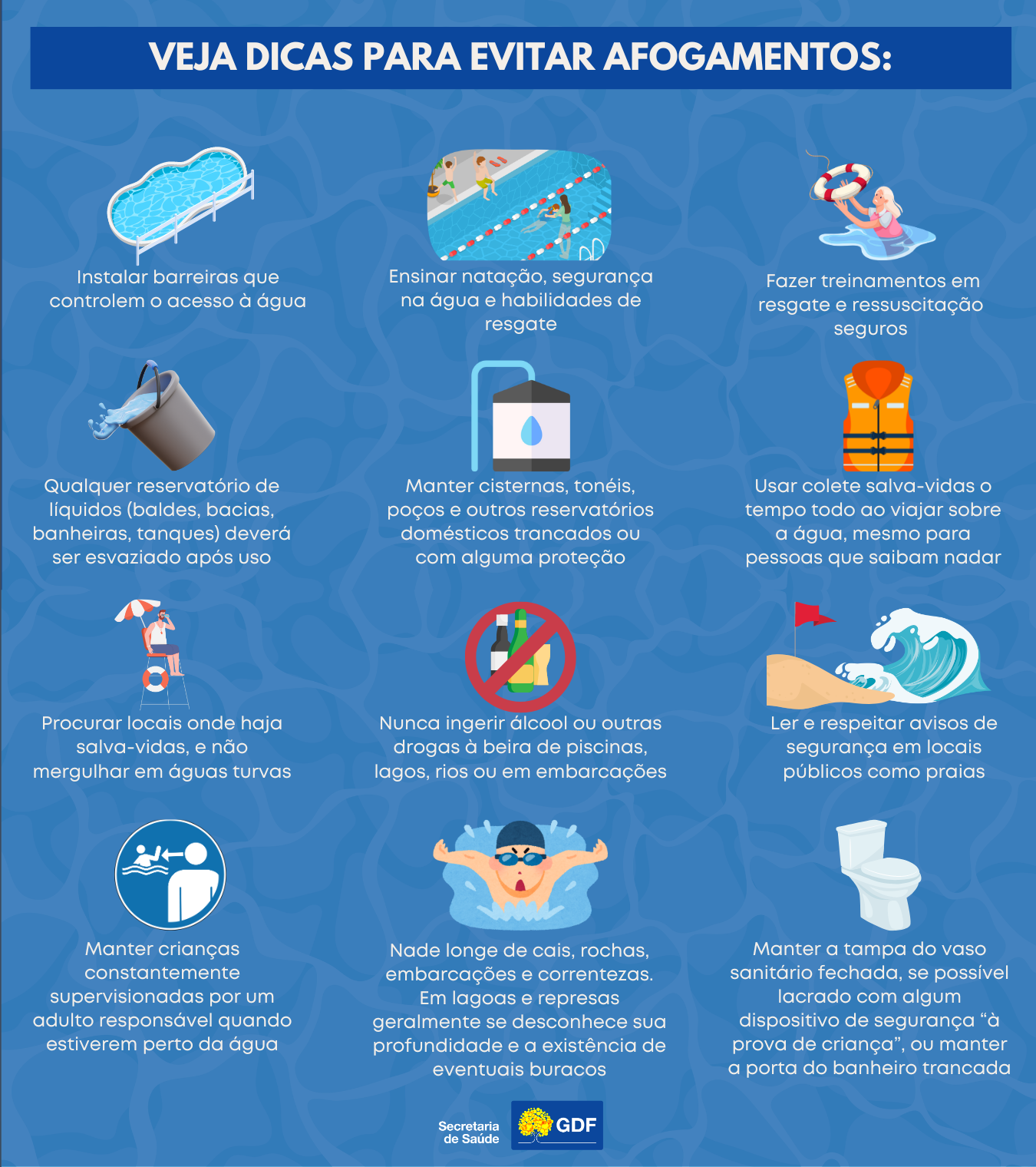 A chefe do Núcleo de Educação em Urgências do Samu-DF, Carolina Azevedo, reforça a necessidade de atenção redobrada com os bebês e crianças próximas à água, e alerta adultos para fatores de risco como o uso de bebida alcoólica em ambientes aquáticos que causa o comprometimento do equilíbrio, da coordenação e da velocidade de reação do indivíduo, até mesmo para quem sabe nadar, aumentando as chances de acidentes.
