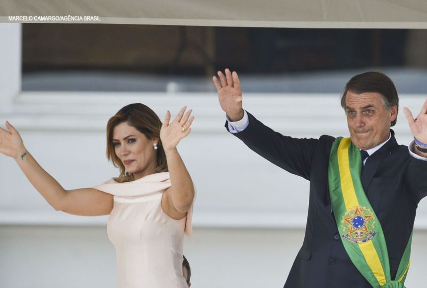 A primeira-dama Michelle Bolsonaro, o presidente Jair Bolsonaro e o vice-presidente, general Hamilton Mourão, durante cerimônia de transmissão da faixa presidencial, no Palácio do Planalto. – Marcelo Camargo/Agência Brasil