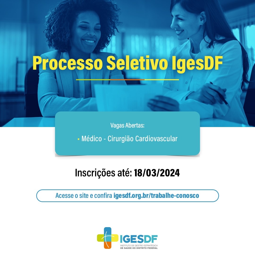 Estão abertas as inscrições para o cadastro reserva de Médico Cirurgião Cardiovascular no Instituto de Gestão Estratégica de Saúde (IgesDF). Os interessados têm até o dia 18 de março de 2024 para se inscreverem. A vaga oferece uma jornada semanal de 24 horas, com remuneração bruta de R$ 14.617,01, além de benefícios.