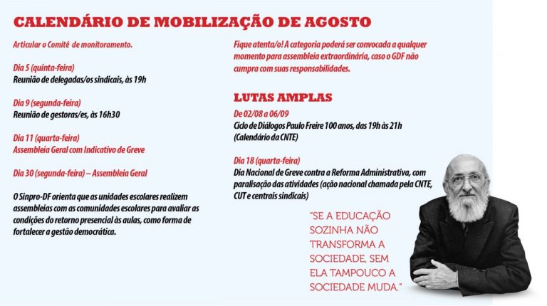 A assembleia desta sexta-feira (30) também aprovou a participação da categoria do magistério público do DF no Dia Nacional de Greve contra a Reforma Administrativa, agendado para 18 de agosto. Neste dia, haverá paralisação das atividades.