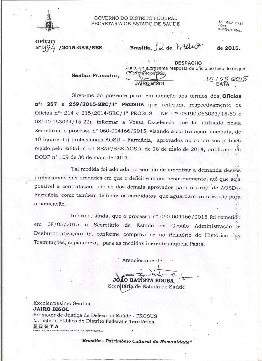 De acordo com a Secretaria: “A Secretaria de Saúde informa que irá cumprir a recomendação do Ministério Público do Distrito Federal e Territórios (MPDFT). Em 2016, a pasta nomeou 22 servidores de AOSD Farmácia. No momento, 21 servidores (com carga horária de 24 horas semanais) estão atuando em áreas como transporte, setores administrativos e finanças.”.