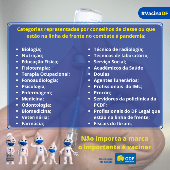 A Secretaria de Saúde reforça o aviso para que os profissionais agendem atendimento e se vacinem o quanto antes para garantir a imunização contra o coronavírus. As 14,4 mil vagas foram abertas de acordo com a disponibilidade de doses que o Distrito Federal recebeu do Ministério da Saúde e, até o momento, em torno de 6,3 mil profissionais aptos fizeram agendamento.