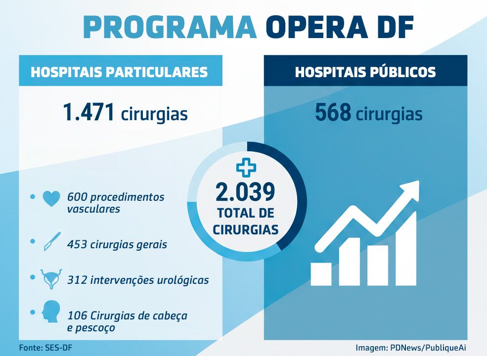 O programa Opera DF totalizou 2.039 cirurgias realizadas, somando 1.471 procedimentos em hospitais particulares e 568 na rede pública. Na rede privada, foram efetuados 600 procedimentos vasculares, 453 de cirurgia geral, 312 intervenções urológicas e 106 de cabeça e pescoço desde setembro. Esses números contribuíram para a diminuição da fila de espera de pacientes. Os hospitais Home, Jardim Botânico, São Mateus, Maria Auxiliadora, Anchieta Ceilândia, Daher e Hospital das Clínicas participaram das ações.