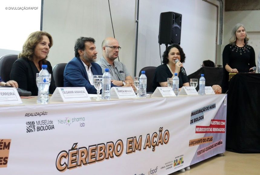 A mesa de abertura da solenidade, na tarde de terça-feira (14), contou com a reitora da UnB, Márcia Abrahão; o vice-presidente da FAPDF, Paulo Nicholas Nunes; a decana de Extensão da UnB, Olgamir Amancia; o coordenador-geral de Ciências da Saúde e Biociências da Diretoria Científica do CNPq, Gilberto Ferreira de Souza; o diretor do Instituto de Biologia da UnB, Eduardo Blum; a professora-coordenadora do Museu de Biologia da UnB, Júlia Klaczko; e a professora coordenadora do Laboratório de Neurofarmacologia da UnB, Márcia Mortari.